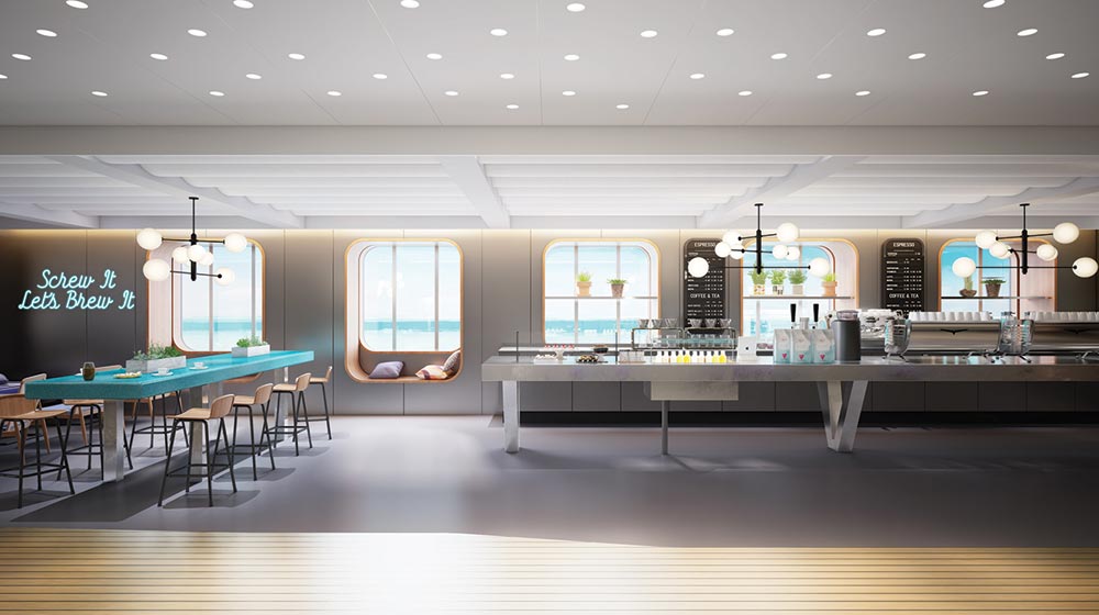 Located in the heart of the ship on deck 7, coffee lovers can gaze out at the sea through a porthole-style window while enjoying their coffee. Designed by Softroom of London, Ministry of Ground features large porthole-style windows designed with their very own window seat so Sailors can gaze out at the ocean while sipping a single-origin coffee. Ministry of Ground has been designed with soft earth-tone finishes and furnished with aquamarine and purple hues for seating, tables and loungers. In addition to great hand-crafted specialty coffees, Sailors visiting Ministry of Ground can indulge in complimentary light cakes and bites with retail items like bags of Intelligentsia Coffee and JoJo loose-leaf teas, coffee cups, kettles and more available for purchase. Ministry of Ground Too is located in The Galley food market, so Sailors can sip their favourite specialty coffee while grabbing a quick bite.