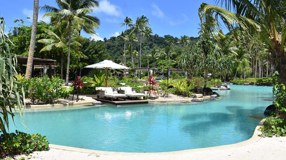 “The design for Laucala is unique and we wanted to maintain that aesthetic but bring in some contemporary and interesting design details,” says Hunt. “Proportions were played with typical Laucala styling, oversize pots and day beds that provide the ultimate luxury and escape. Quirky and unique pieces of furniture were sourced, or custom designed from South East Asia, along with custom-printed, vintage-style pacific art fabrics in custom colours from Australia.”