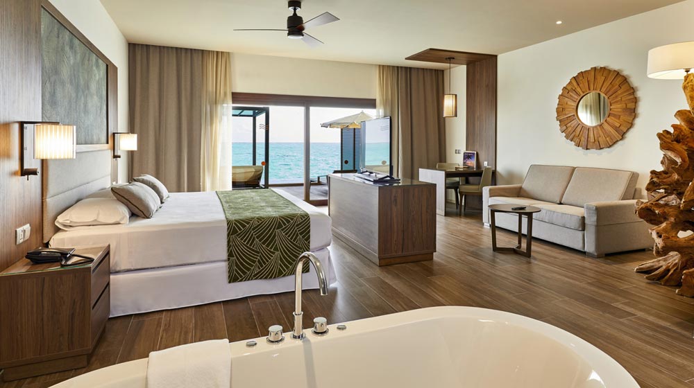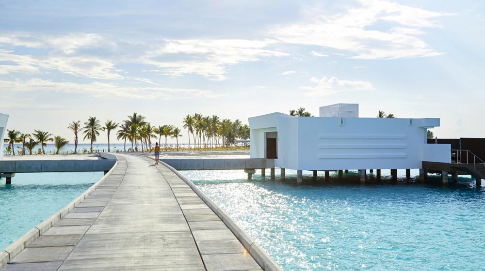 The two properties, located on two separate islands, are linked by an 800-metre walkway over the water. The 72 suites over the water of the Riu Palace Maldivas are located both sides of this walkway.