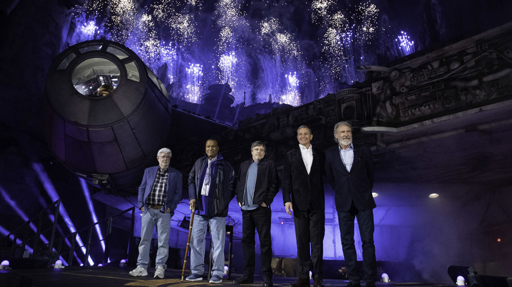 To dedicate Star Wars: Galaxy’s Edge, Iger was joined in front of the Millennium Falcon by Star Wars icons including George Lucas, Harrison Ford, Mark Hamill and Billy Dee Williams.