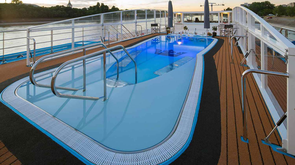 The ship has a heated Sun Deck pool with a swim-up bar, a spa and hair salon.