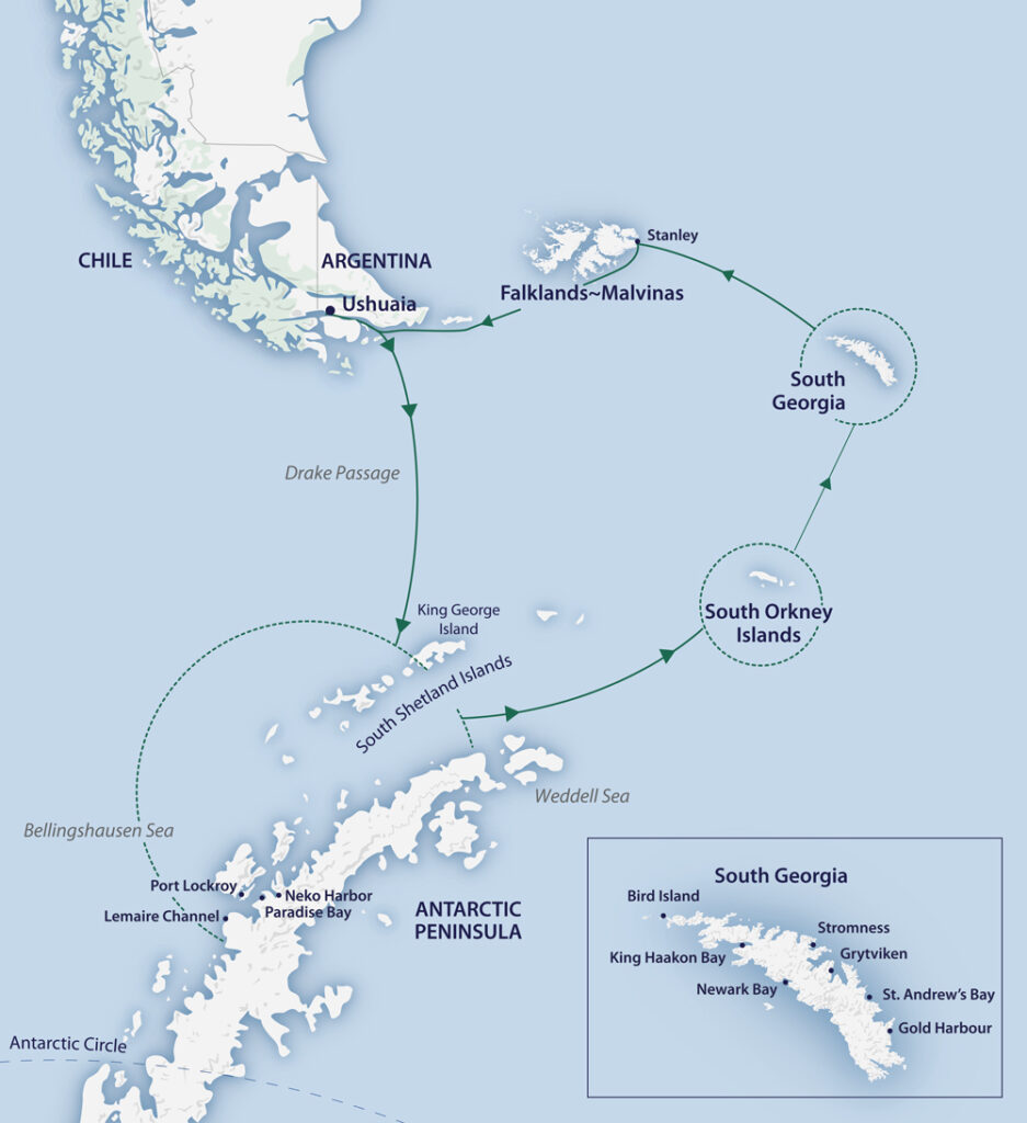The 22-day total Solar Eclipse in Antarctica voyage departs Ushuaia, Argentina on 24 November 2021 and includes planned visits to the South Shetland Islands, the Antarctic Peninsula, Elephant Island, South Georgia and the Falklands-Malvinas. *In true expedition style, itineraries are always subject to change due to ice and weather conditions.