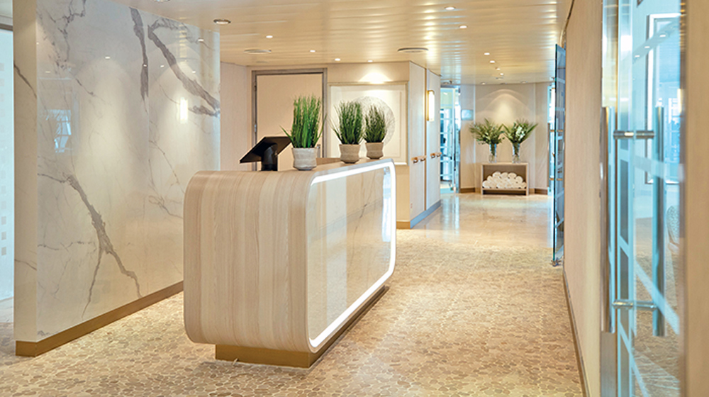 The relaxation area has been updated with light tones, making it a perfect retreat before or after a spa visit. The beauty salon has been expanded to include a dedicated pedicure and manicure area that has floor-to-ceiling ocean views. Stations for hair treatments and make-up round out the array of services available in the top deck spa.