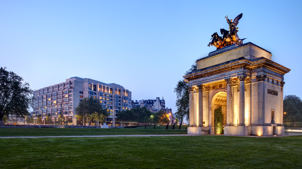 InterContinental London Park Lane, at the junction of Park Lane and Piccadilly at the north-east corner of Hyde Park Corner, is a solid stone structure that blends beautifully with Buckingham Palace, just ten minutes’ walk away. Hyde Park Corner is dominated by Wellington Arch, also known as Constitution Arch, topped by the 1912 life-sized statue of four horses known as the Quadriga (it was sculpted by Decimus Burton). The largest bronze in England, eight people have dined inside the statue, which was a replacement for an earlier 1828 statue of the Duke of Wellington on horseback which had to be moved because of a road-widening scheme. You can look across to the Duke’s home, Apsley House, from the seventh floor Club InterContinental at InterContinental London Park Lane.