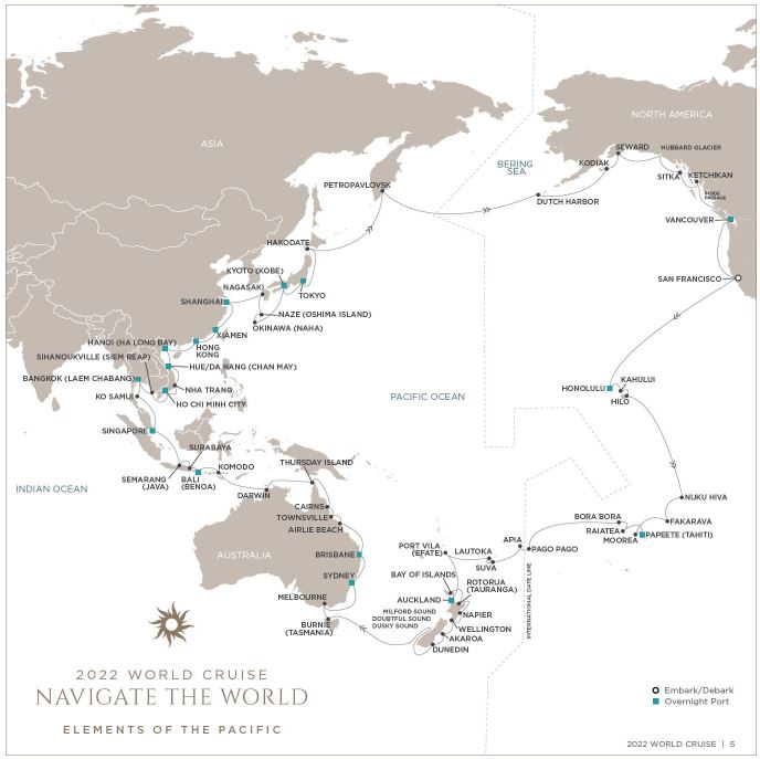 Embarking in January 2022 roundtrip from San Francisco, the voyage circumnavigates the inspiring Pacific Rim aboard the all-suite, all-balcony Seven Seas Mariner. The voyage will explore 17 countries and 59 ports of call with 18 overnight stays.