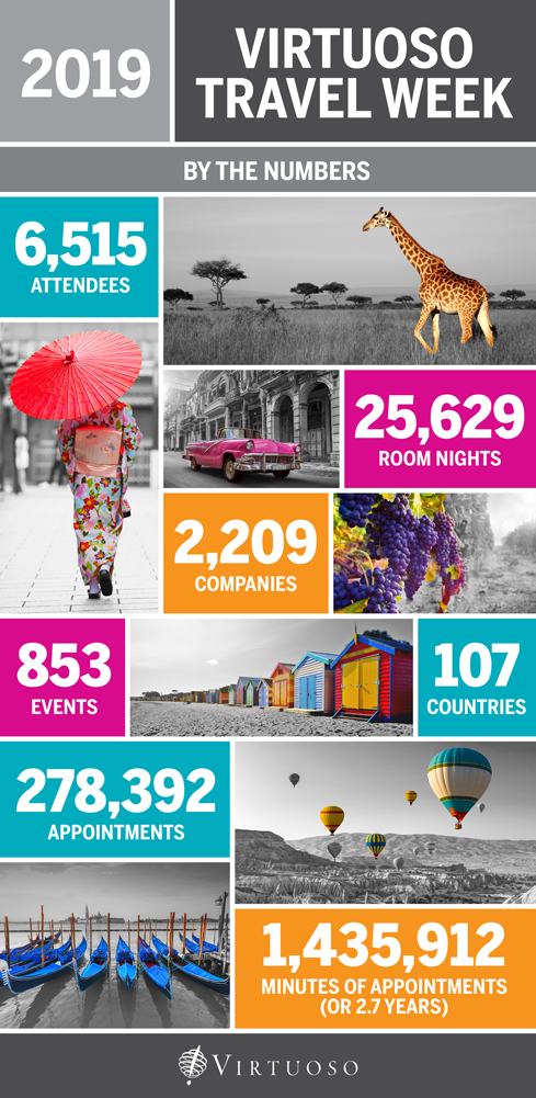 This year’s Virtuoso Travel Week has seen a 7% bump in attendance, with a record-breaking 6,515 travel professionals from 107 countries, who are spending a week at Bellagion Resort & Casino, ARIA Resort & Casino and Vdara Hotel & Spa. Over the course of the next week, there will be almost 280,000 one-to-one appointments between travel advisors and suppliers/partners.