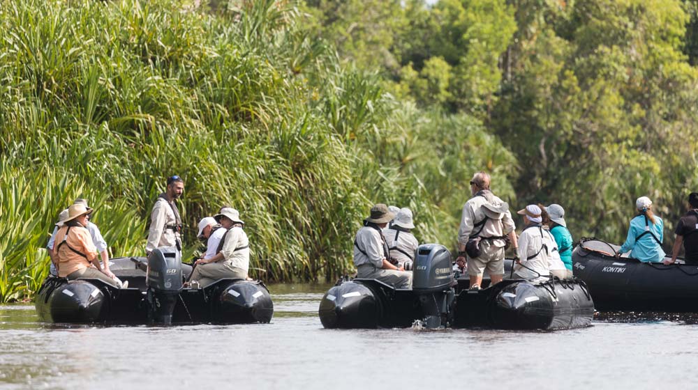 Camp Leakey! There is much excitement and expectation when we arrived in Kumai, at the mouth of the Kumai River and the gateway to Borneo’s Tanung Puting National Park. Here guests had the choice of two expeditions – an all-day adventure taking in Camp Leakey, a challenging 14-nautical-mile, two-and-a-half-hour Zodiac ride in the National Park to an orangutan feeding station, then a switch from Zodiacs to local covered Klotok boats, to continue up the river to enjoy lunch and along the way spot proboscis monkeys, gibbons, long-tailed macaques and colourful birds such as the beautiful Rhinoceros Hornbill.