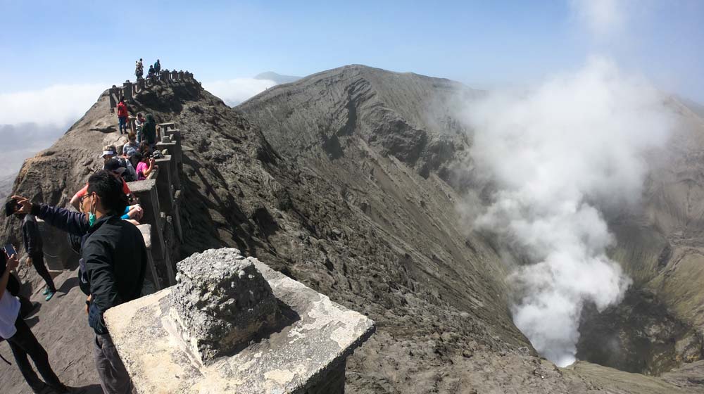 Another day and it’s Mount Bromo, an active volcano in Probolingo and not such a heart-thumping climb, at only 2,329 metres, as Ijen. With masks to protect us from airborne ash, we mount ponies on the caldera rim to be led by their owners across a plain of ashen, volcanic sand, known at the Sea of Sand, looking like extras in a Mad Max movie, before dismounting to climb the 250 vertical steps to Bromo’s smoke-filled crater.