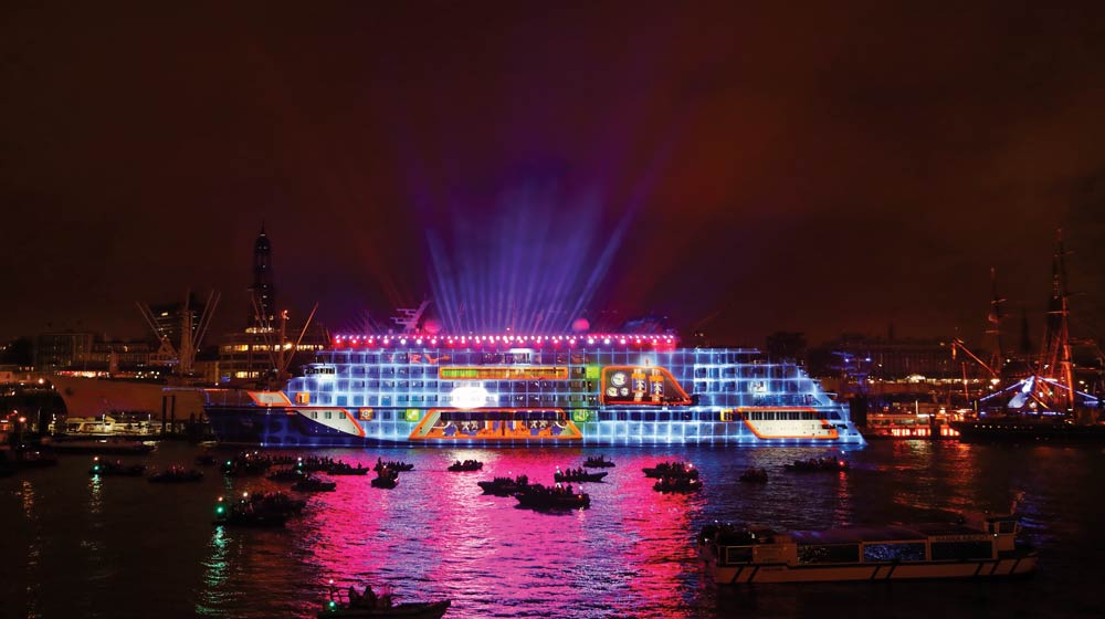 Guests went on a virtual cruise to the most remote corners of the world, leaving the bustling city behind to visit the Arctic, the Antarctic and the Amazon. Icy landscapes, whales, penguins, green jungle oases, colourful birds and many other landscapes and creatures were projected onto the outside of the ship.The 3D mapping – 140 metres wide and 22 metres high – which was designed and programmed specially for the event, was projected through the dark Hamburg sky onto the side of the ship by eleven high-powered projectors from the south side of the Elbe. Musical accompaniment was provided by Oonagh, the German pop star and two-time Echo winner, as well as Terje Isunget, the Norwegian musician known for his unique instruments made from ice.