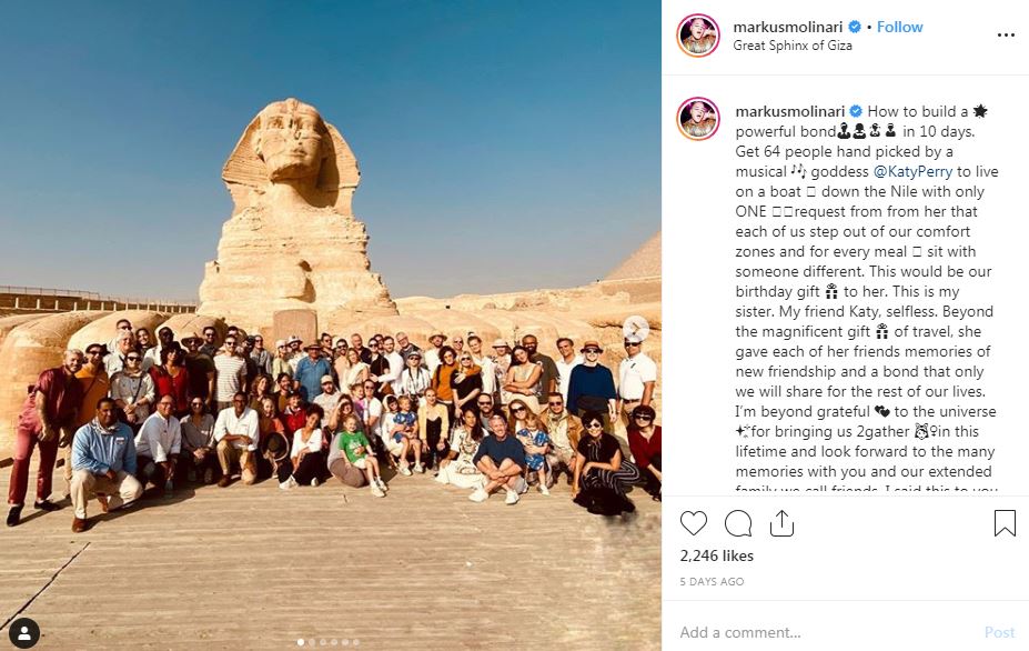 Jewellery designer Markus Molinari let the cat out of the bag in a post a few days ago, posting on Instagram: How to build a ?powerful bond?‍?‍?‍? in 10 days. Get 64 people hand picked by a musical ? goddess @KatyPerry to live on a boat down the Nile with only ONE request from from her that each of us step out of our comfort zones and for every meal sit with someone different.”