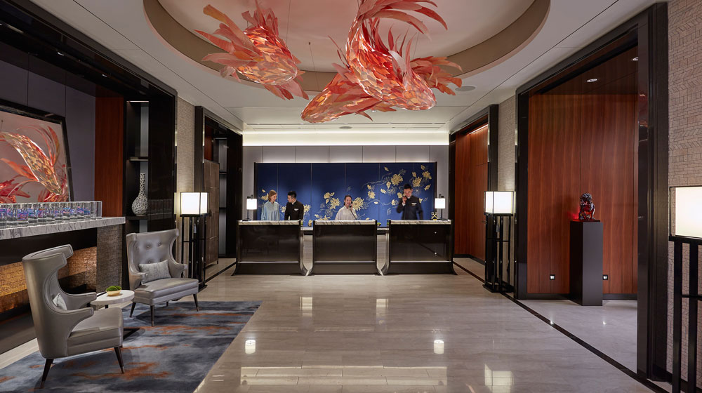 And now, five minutes’ drive – or 18 minutes’ walk – south to the southeast corner of the Forbidden City, you come to Mandarin Oriental Wangfujing, named for the street it is on, across from Hamley’s toy store. This is, honestly, another most unusual hotel, which opened 18 March 2019. As if in defiance of other hostelries that soar up and up, here the 73 bedrooms spread out on only the top two floors of the six-floor building, owned by Hongkong Land’s Wangfu Central Real Estate Development Company Ltd. Below what is essentially an ‘anchor’ hotel is an upmarket collection – please do not use the pleb word ‘mall’ here – of the world’s best retail brands. The architect of this horizontal hotel is KPF, who have also recently unveiled the highly-vertical Rosewood Hong Kong (interiors are by HBA). Arrive, and you are met by charming young women in flowing blouses topped, in cold months, by short capes. Immediately inside, past the Audemars Piguet store, you see a white fan specially designed by Tim Yip, art and costume director for the Beijing handover ceremony at the 2004 Athens Olympics. Above is a Frank Gehry blowfish sculpture.