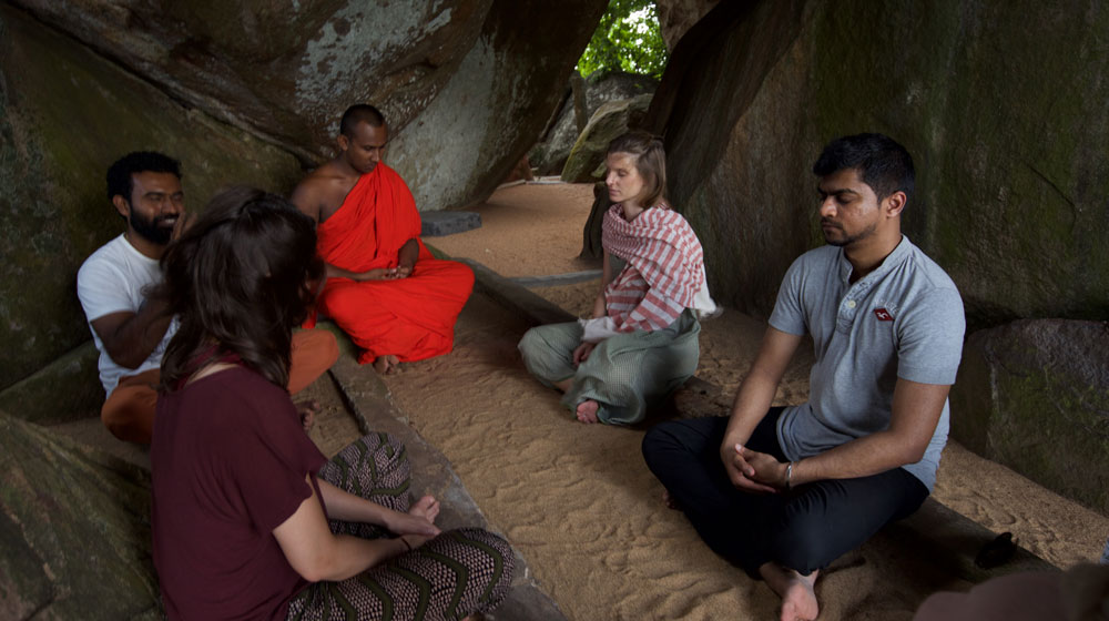 We have so many but one is we go into rural Sri Lanka’s hermitages where monks meditate from morning until evening. They are mostly in rural areas – very difficult to traverse, either in jungles or mountains – so we go into those rural temples and we do almsgiving for the monks, providing them with lunch. Monks have only two meals a day: an early breakfast with sunrise and another meal around 11:30am. Monks have no kitchens and they don’t cook so it’s the surrounding communities providing alms that sustains them, and this is what we offer to our clients. It’s not a touristic experience, no other tours are around, it’s a totally private experience.