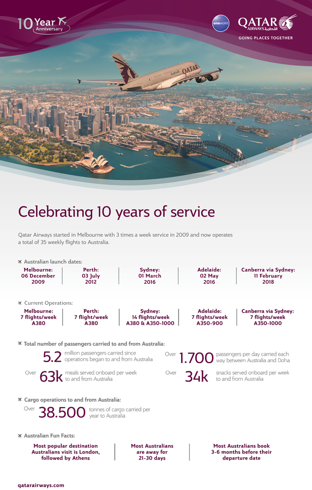 Qatar Airways first launched in Australia in 2009, offering flights three times a week from Melbourne to Doha, Qatar. The airline now operates 35 flights per week to and from Australia with flights from Melbourne, Sydney, Adelaide, Perth and Canberra. On a daily basis, the airline averages over 1,700 passengers each way between Australia and Doha, with London and Athens being the top destinations for Australian passengers.