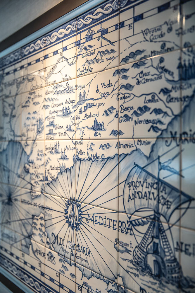 A hand-painted tile mosaic depicting the Iberian Peninsula and its surrounding oceans is one of the most dramatic of the azulejo designs. Located in the Andorinha’s reception area and reminiscent of early navigational charts, the three-foot mosaic pays tribute to Portugal’s rich maritime heritage of the 15th and 16th centuries.Another recurring theme aboard the Andorinha are grapevines, reflecting both Portugal’s 2,500 years of winemaking traditions and the continued influence of viniculture on Portuguese society today.