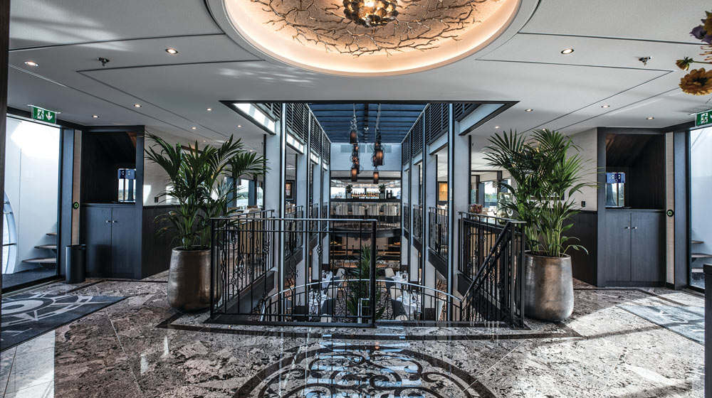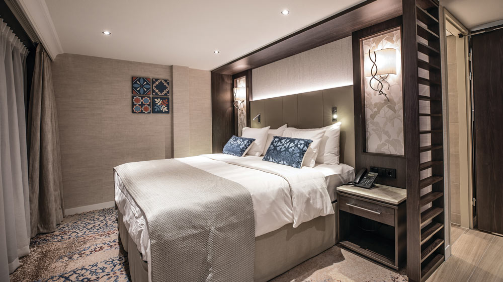 A recurring design theme on the Andorinha riverboat is the traditional painted ceramic tiles, or azulejos, which were brought to the Iberian Peninsula by the Moors and gained widespread popularity in Portugal during the 1500s. Azulejo tiles (Arabic for ‘polished stone’) adorn several areas of the Andorinha, including its main Compass Rose restaurant and Arthur’s, an alternative dining venue on the ship’s Sun Deck. Fabric facsimiles of the tiles accent one wall of each cabin, with the cabin’s throw pillows and carpeting continuing the theme. Within the ship’s soaring atrium, railings, carpeting and lamps suspended from the ceiling all boast curving patterns reminiscent of azulejo designs.