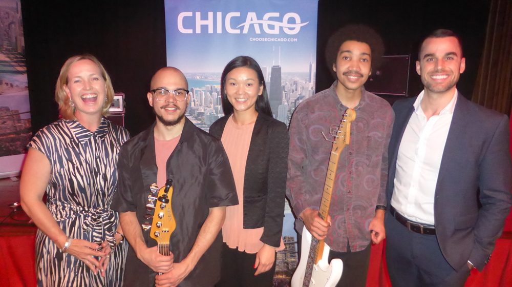 Lead image: At Choose Chicago’s Sydney event, from left to right are: Amanda Bolger, Qantas; BlackFinn, bassist; Ann Tok, Choose Chicago; Michael Damani, Blues singer-songwriter; and Will Lehnertz, Qantas.
