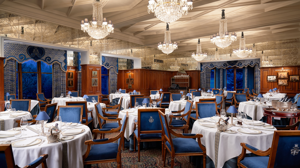 I breakfast in the signature restaurant, the George V Dining Room. I look up at 12 multi-level early-20th-century chandeliers, and down at plush multi-coloured Victorian carpeting. One buffet station has a giant china bento box, each compartment with a different home-made yoghurt or fruit: nearby are half-glass open bottles of drink and today’s smoothie, blackberries. Another station has dozens of bread, all homemade. A la carte includes kippers and farl (potato flatbread) with truffle sour cream and oil.