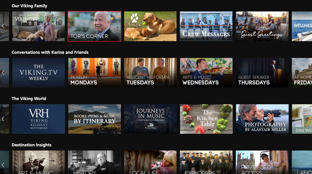 The platform can be used to access a suite of information such as Viking’s Guest Speakers, cultural partners, destination insights, a channel focused on wellness and staying healthy “during these unusual times”, crew messages, a cook book of recipes (The Kitchen Table), video updates by Viking’s Chairman Torstein Hagen, and there’s even an ebook series on the Viking Family’s pet, Finse.