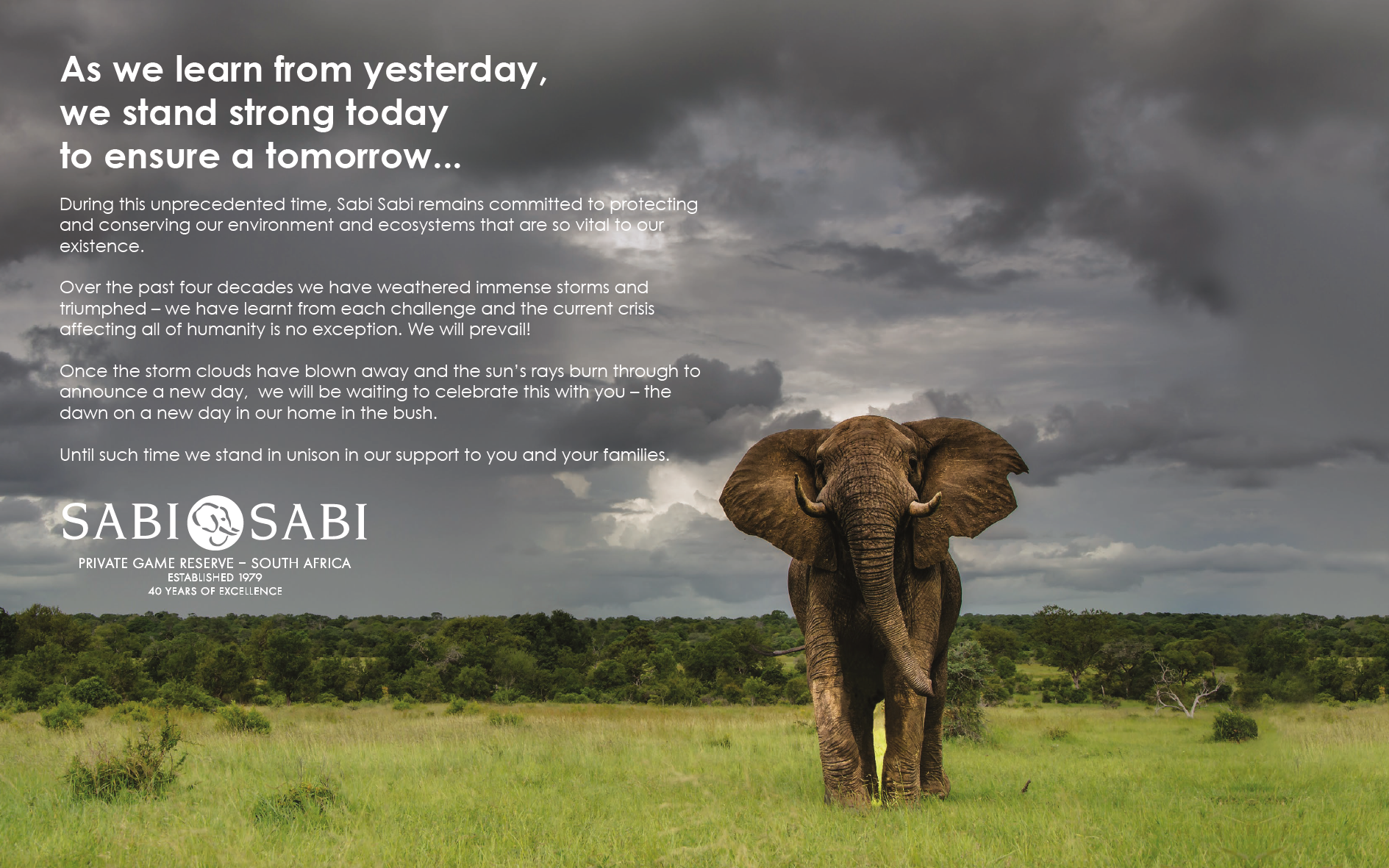 “Never before have we been faced with challenges quite to the scale of our current situation. At Sabi Sabi we are following the philosophy of ‘As we learn from yesterday, we stand strong today to ensure a tomorrow’ and we believe the actions taken today will assist in seeing the end of this situation sooner rather than later.”