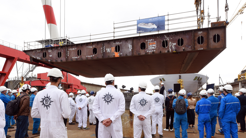 Zoe Africa Vago, daughter of Alexa Aponte-Vago and her husband Pierfrancesco Vago, MSC Cruises’ Executive Chairman, and Aurore Bezard from the HR Department of Chantiers de I’Atlantique performed the traditional maritime ritual as godmothers representing the shipowner and the shipbuilder when they placed two coins under the keel as the historical sign of blessing and good fortune for the project, and the ship’s operational life at sea.