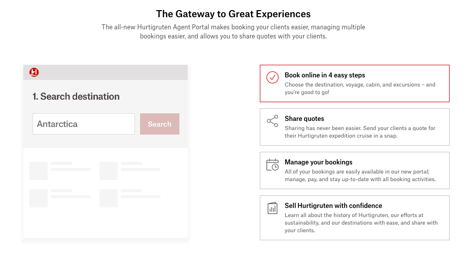 Offering a seamless, user-friendly booking experience and an engaging resource and learning centre, the new Hurtigruten Agent Portal is part of Hurtigruten’s ongoing commitment to providing industry-leading, streamlined and efficient tools for managing all sales activities.