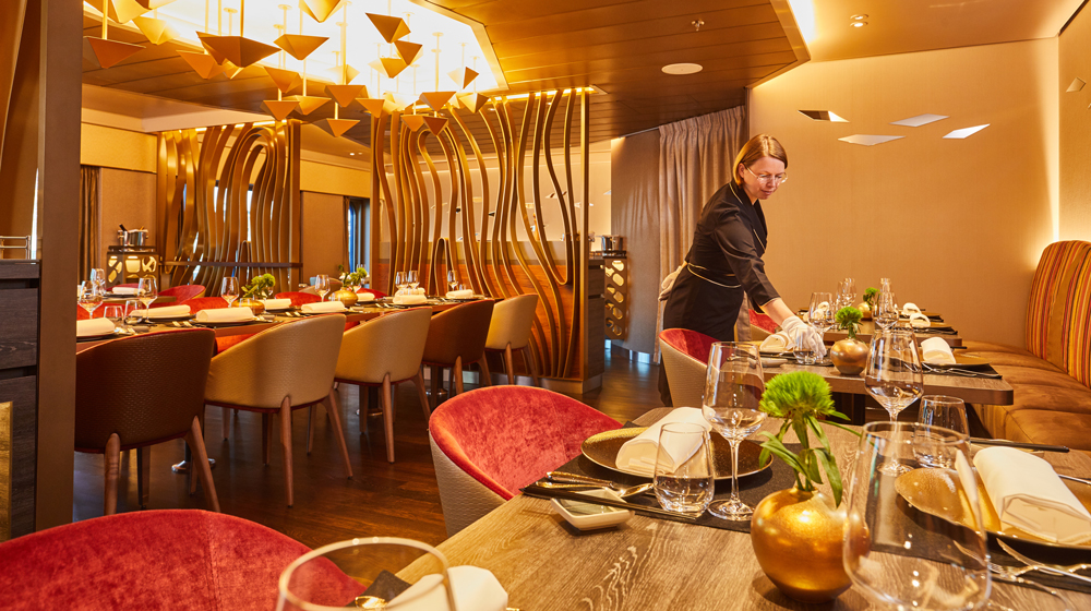 - The new standards will be seamlessly integrated into life onboard so that the enjoyment of guests is as unimpaired as possible: the crew-to-passenger ratio of 1:1 means individual and personal service. The number of seats available in the restaurants will be reduced, and the opening times will be extended. There will be no self-service in the restaurants, the buffets or in the bars. All meals can also be served in cabins, with 24-hour room service available. Hapag-Lloyd Cruises also guarantees a 100% fresh air supply in the cabins and all public areas.