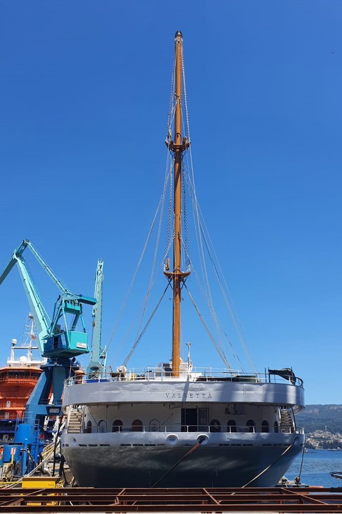 The masts, already fully equipped with shrouds and stays, are now being erected in Vigo, Spain. The masts will carry the total sail area of almost 4,100 square metres. Raising the 54-metre aft mast is an important prerequisite for the completion of Sea Cloud Spirit. The mizzenmast not only carries the sails but also contains the exhaust system for the Sea Cloud Spirit‘s engine.