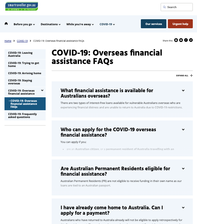 Minister for Foreign Affairs, Senator the Hon Marise Payne, said the Department of Foreign Affairs and Trade is making a Hardship Program available, offering emergency assistance for those Aussies stuck abroad. Loans of up $2,000 for individuals and up to $5,000 for families are intended to cover temporary accommodation and living expenses until they can return.