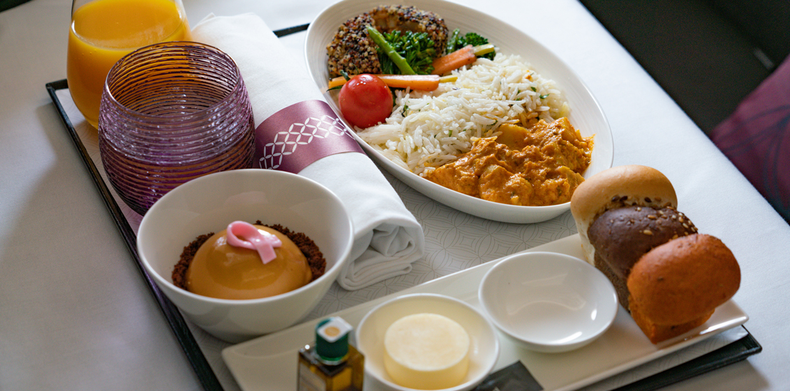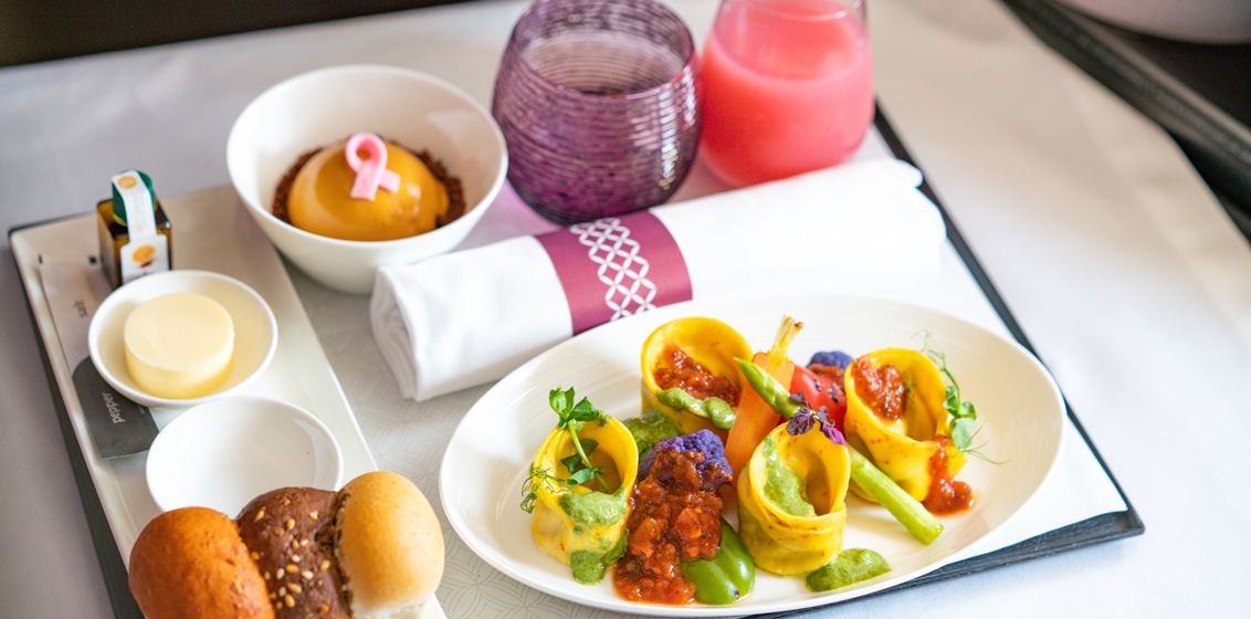 Since the start of the COVID-19 crisis, the airline has applied necessary health and safety measures onboard its flights, including in the preparation and serving of food. Business Class meals are served covered on a tray instead of a table set up, and a cutlery wrap is offered to passengers as an alternative to individual cutlery service, in an effort to minimise contact between crew and passengers.