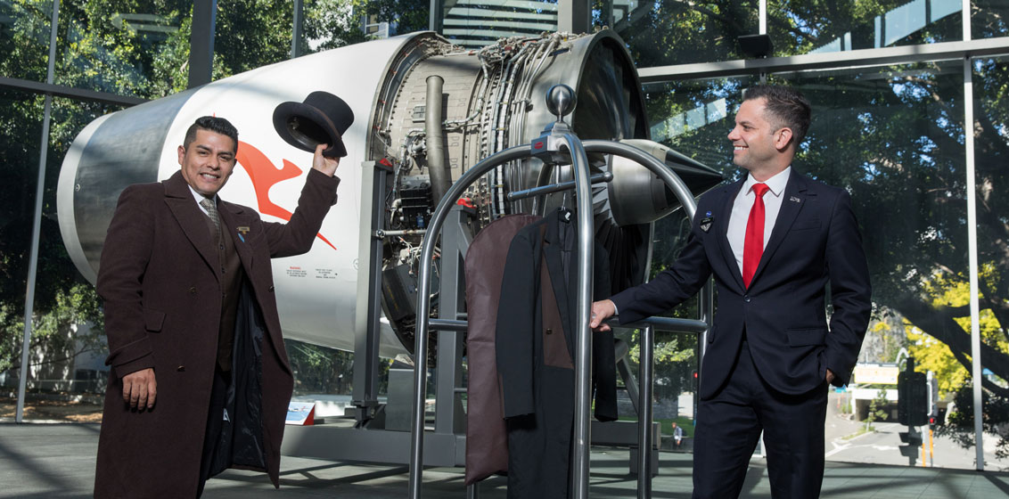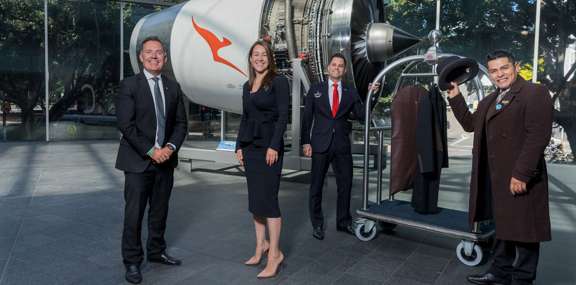 Lead image: Simon McGrath, CEO Accor Asia Pacific, with Olivia Wirth, CEO Qantas Loyalty, with Qantas cabin crew and Accor bellhop