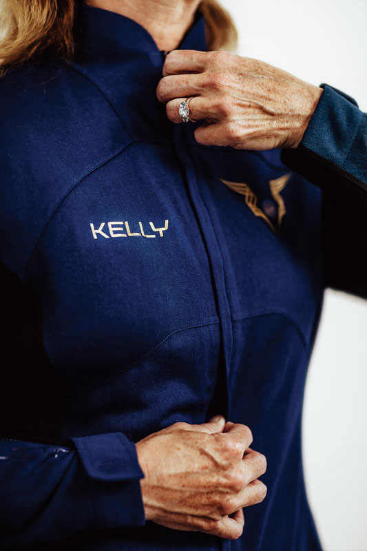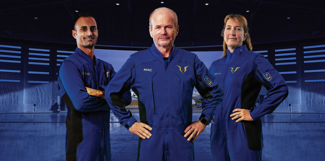 The individually tailored spacesuits feature a black panel and the Virgin Galactic pilot wings emblem to distinguish them from Virgin Galactic’s customers.