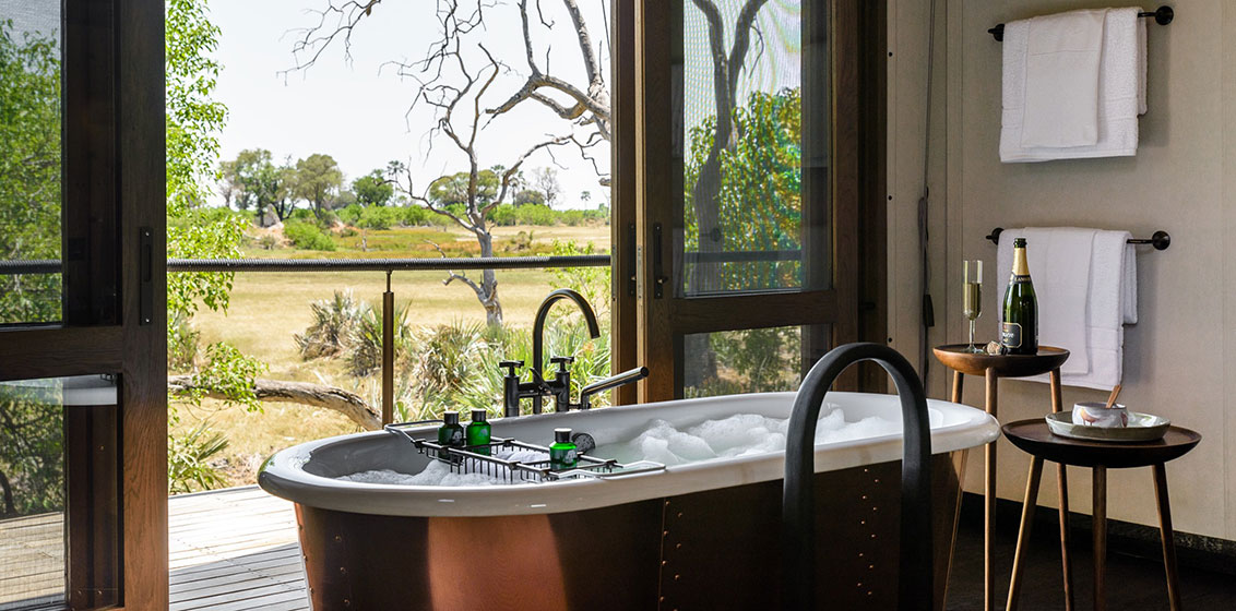Bathrooms are both indoor and outdoor and feature a free-standing bath overlooking the Okavango wilderness.