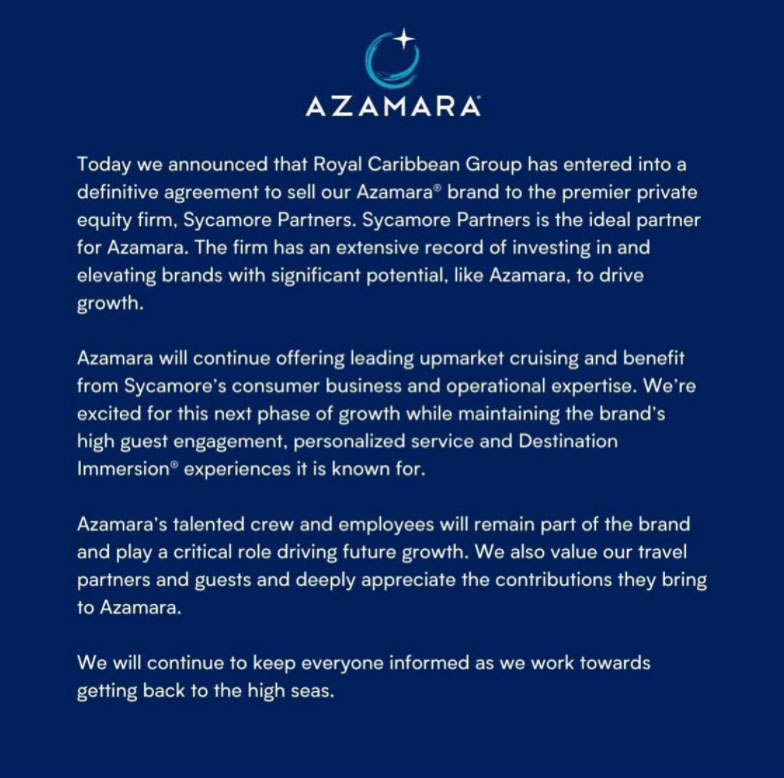 “Even so, Azamara remains a strong brand with its own tremendous potential for growth, and Sycamore’s track record demonstrates that they will be good stewards of what the Azamara team has built over the past 13 years.”
