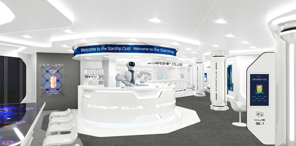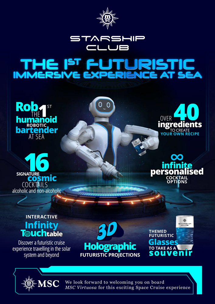 Cocktails are served in custom-designed futuristic glasses that guests can collect as a lasting souvenir of the MSC Starship Club experience. Guests will be able to return to the club multiple times over the course of their cruise, experiencing a new interaction with Rob each time.