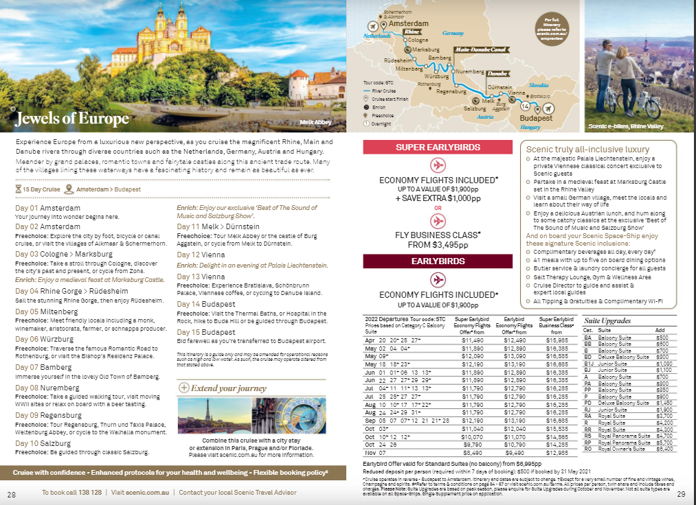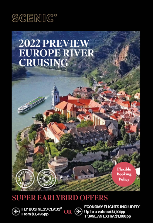 Australian luxury cruise operator Scenic has unveiled its 2022 Preview Europe River Cruising brochure, offering Super Earlybird offers on a collection of itineraries.The 76-page brochure features 11 voyages in Europe aboard its no-more-than 163-guest ships, including Scenic Jasper, Scenic Opal, Scenic Amber, Scenic Crystal, Scenic Jewel, Scenic Jade, Scenic Ruby, Scenic Pearl, Scenic Sapphire, Scenic Diamond, Scenic Gem and Scenic Azure.