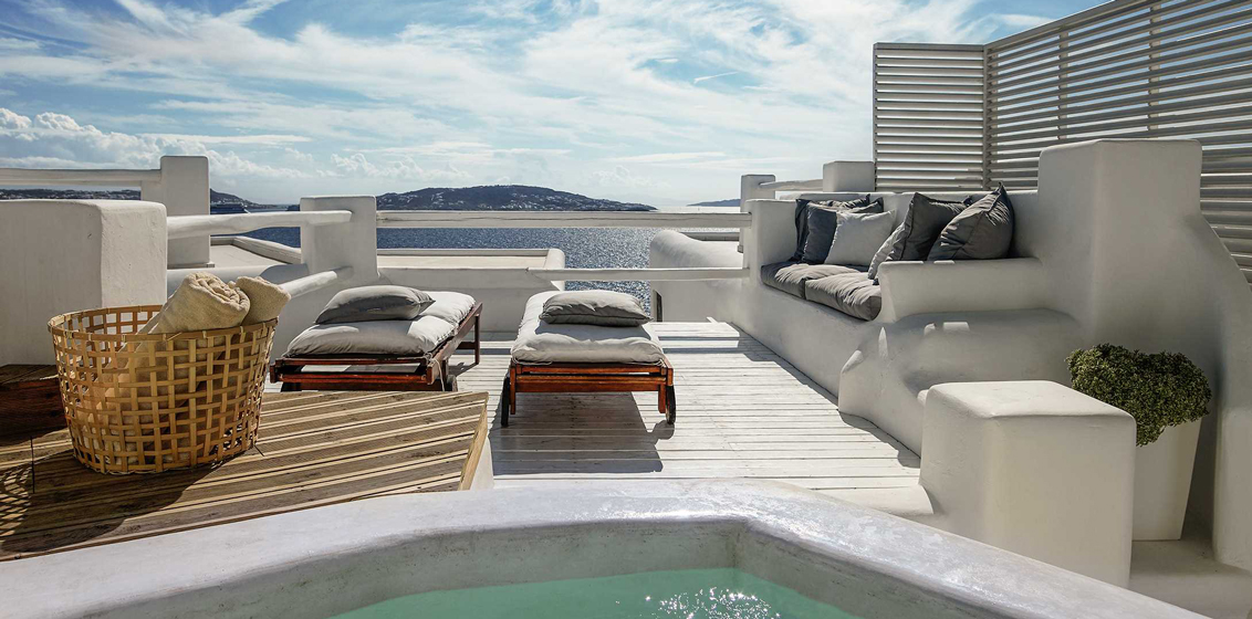 Intimacy and privacy are the mainstays of Rocabella Mykonos Hotel, which offers an inviting world of wellness and a wood, stone, and sisal design scheme that merges into the landscape.