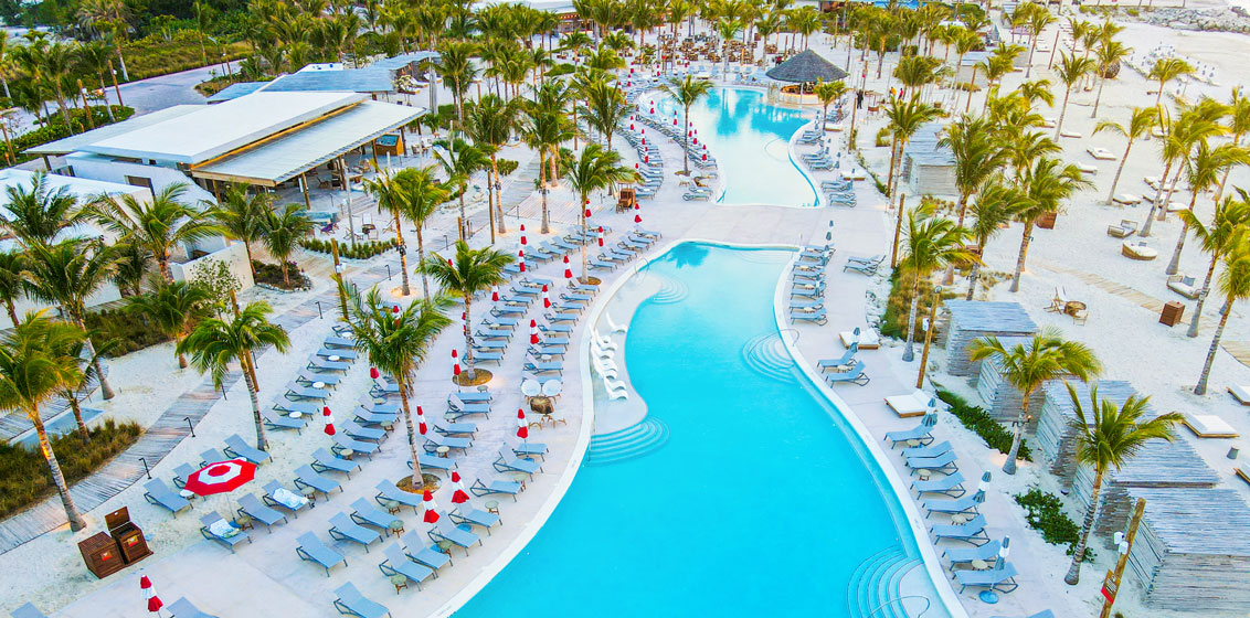 The new beach club is a resort-like experience designed for relaxation and sits on the westernmost part of the Bahamian islands. This photo and video gallery (click an image to zoom in) shows the beach club centred around an expansive lagoon-style pool.