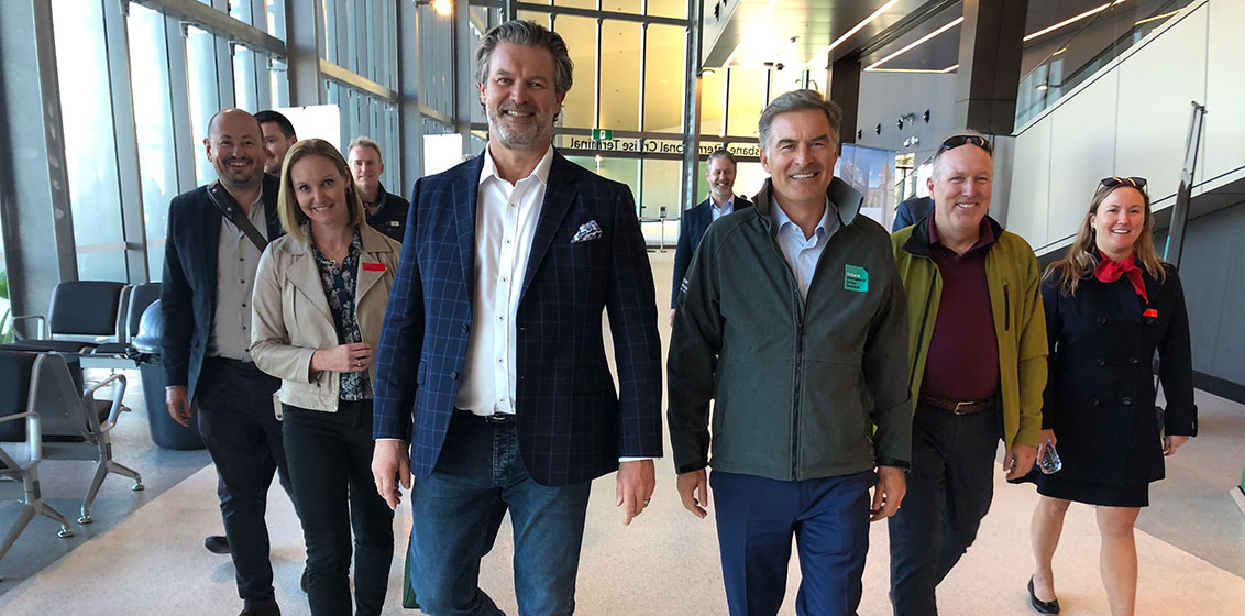 Lead image: Sture Myrmell, President Carnival Australia and Roy Cummins, CEO Port of Brisbane lead a group of travel agents on a tour of the state of the art Brisbane International Cruise Terminal.