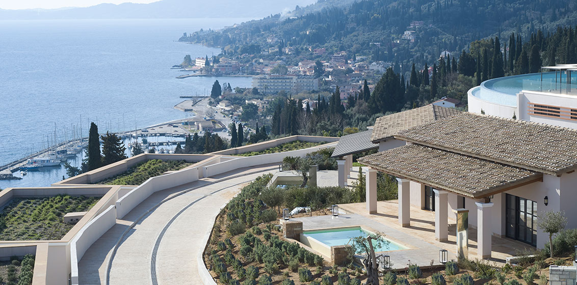 Set on a hilltop estate in Corfu’s Akra Punta Bay, near Benitses Village, the new luxury resort debuts with a collection of 159 guest rooms, suites and 37 one to four-bedroom pool villas. Each pool villa evokes the feeling of an authentic, and private Corfu home with outdoor pavilions, terracotta rooftops and private pools.