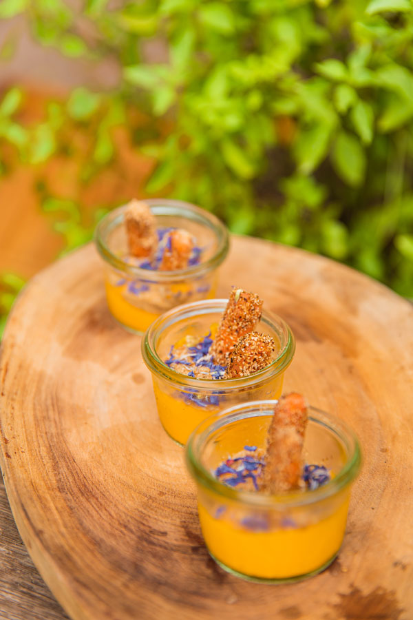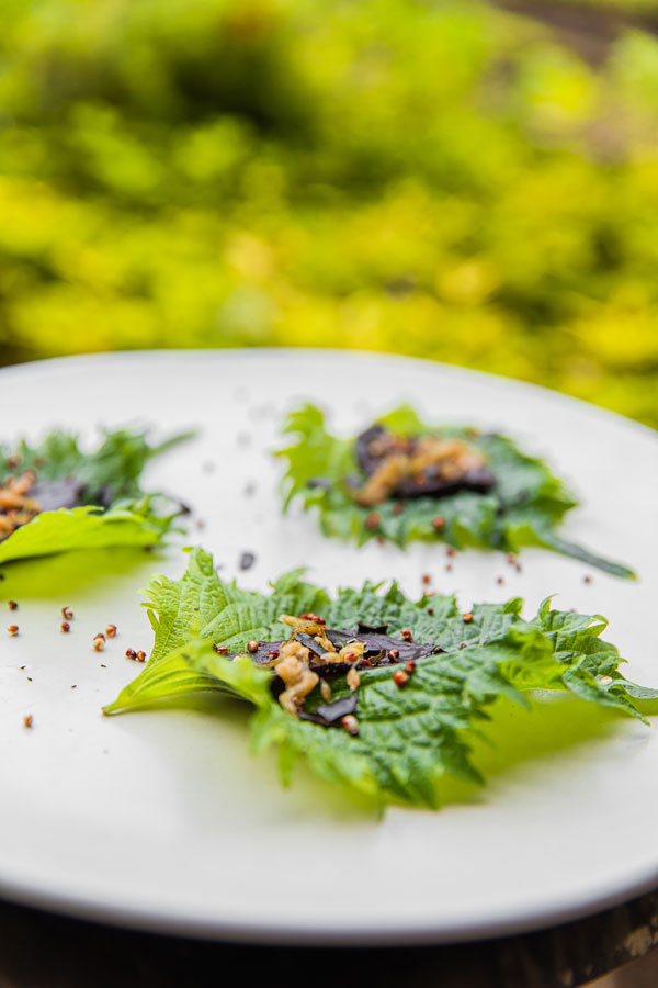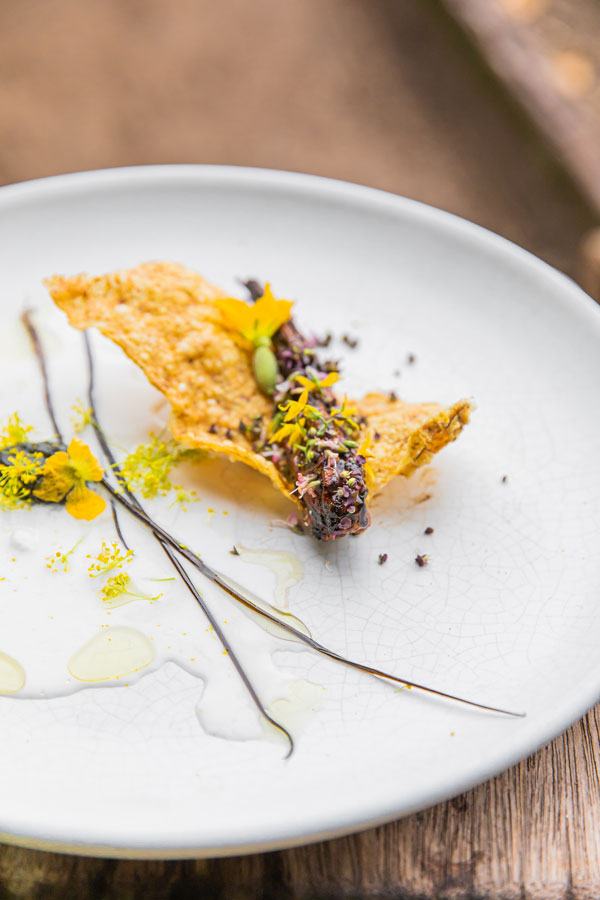 Highlights include: the Purple menu’s Cleansing hibiscus kombucha, blue potato chips and salted beetroots, and Crispy aubergine, with rouille, blue potatoes, prickly ash vinegar, amaranth, wild garden purslane and sweet basil flower; Raw pumpkin, orange beetroots, almond ricotta, leek ash, finger lime, garden flowers, carrot chips and herb soya on the Orange menu; the Yellow menu’s Grain course, with triple- cooked carrot, fermented black garlic, Maldivian curry, coconut sour cream, black truffle and Japanese spring onions; Fire on the Green menu, with grilled pressed portobello mushroom, pea purée, salted lemons, raw asparagus, ramson flower, shitake, morels krapow and crispy holy basil; and the Red menu’s Sweets, with chocolate, beetroots, almond cake, porridge ice cream, raw sun choke, caramelised ginger and garden herbs.