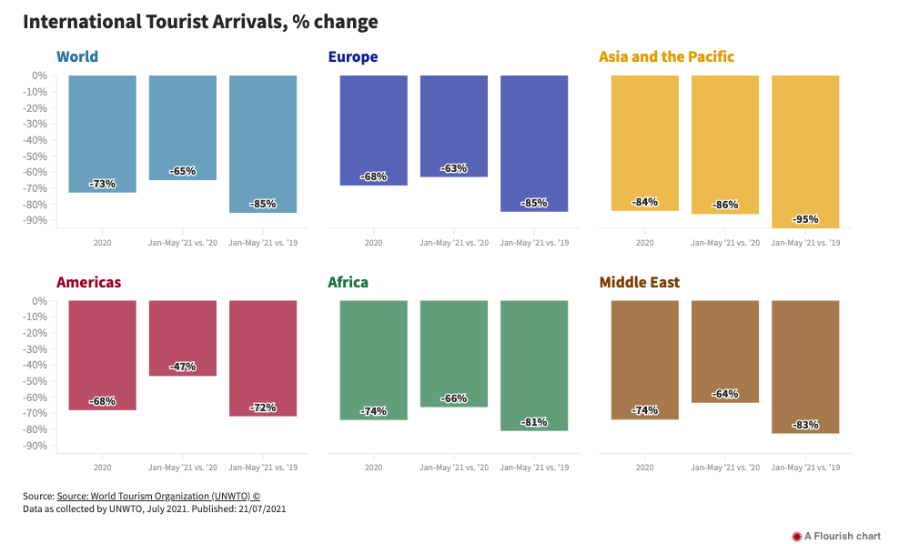 According to UNWTO’s data, over the first five months of the year, world destinations recorded 147 million fewer international arrivals (overnight visitors) compared to the same period of 2020, or 460 million less than pre-pandemic year of 2019. However, the data does point to a relatively small upturn in May, with arrivals declining by 82% (versus May 2019), after falling by 86% in April. This slight upward trend emerged as some destinations started to ease restrictions and consumer confidence rose slightly.