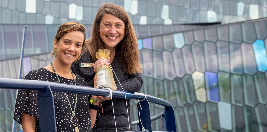 Godmothers Jen Martin, Lindblad Expeditions’ Director of Field Staff and Expedition Development, and Ana Esteves, Director of Hotel Operations, also gave a traditional blessing and broke a champagne bottle across the ship’s bow.