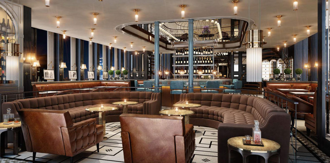 The European restaurant features Italian mosaic flooring by Sicis, Knoll chairs, leather upholstered benches, old-world chandeliers and floor-to-ceiling windows, showcasing spectacular views of Jakarta’s skyline from the Sudirman Central Business District.