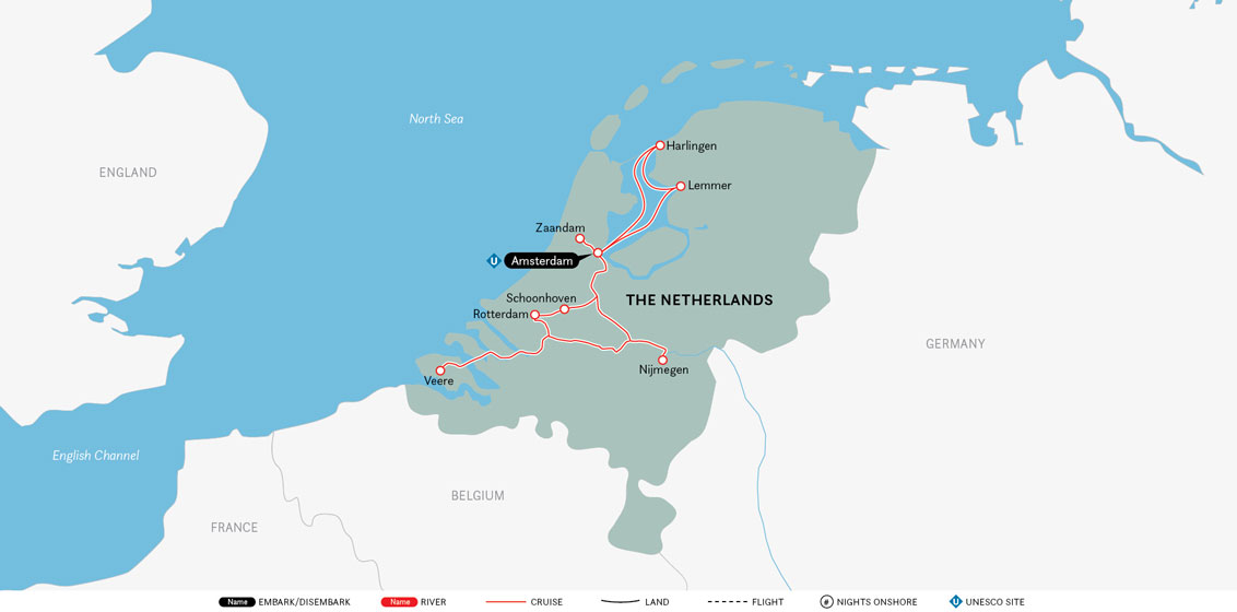 The 8-day Dutch Delight voyage aboard the 130-guest River Empress operates roundtrip from Amsterdam in July and August, staying entirely within the Netherlands and exploring the Delta and the towns of Harlingen, Nijmegen, Veere, Rotterdam, Schoonhoven and Zaandam.