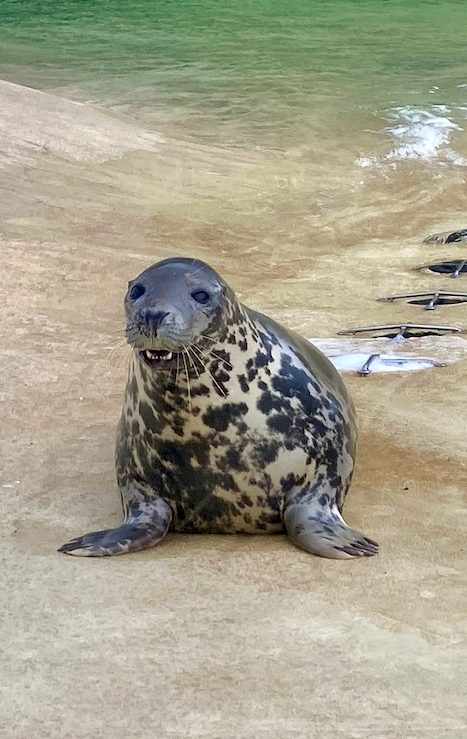 Meinfelder, a veterinarian at the Friedrichskoog seal station, took over the representation of the symbolic godmother of the 230-passenger luxury ship as the real godmother, Nemirseta (called ‘Nemi’), is a gray seal and a foundling (adopted and cared for by others since a pup).
