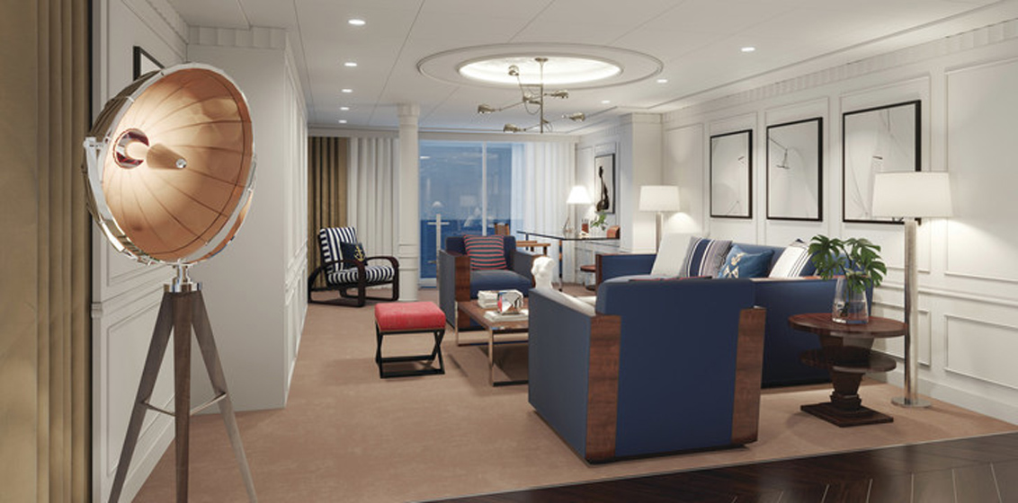 Vista will feature a trio of Owner’s Suites, located on Decks 8, 9 and 10, each of which reaches the full beam of the ship. Measuring 223 square metres and styled in Ralph Lauren Home.