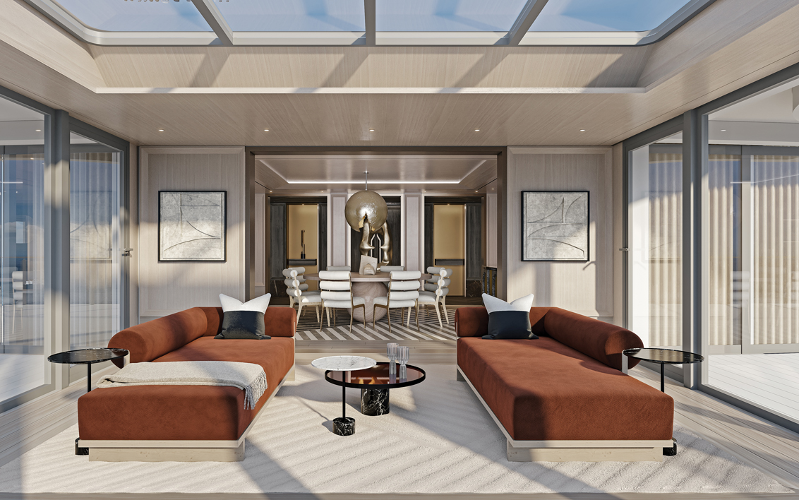 The 413 square metre suite, which overlooks the bow of the ship, modernises the traditional, offering pure luxury in the form of two spacious bedrooms, two and a half marble and stone detailed bathrooms, a living room with personalised bar set-up and a dining room.