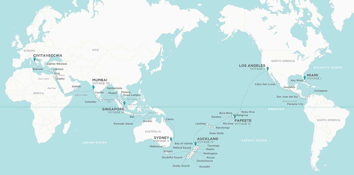 The voyage features 14 overnight calls in Panama City, Cabo San Lucas, Bora Bora and Papeete, Auckland, Napier, Hobart, Sydney, Cairns, Bali, Colombo, Cochin, Mumbai and Eilat.