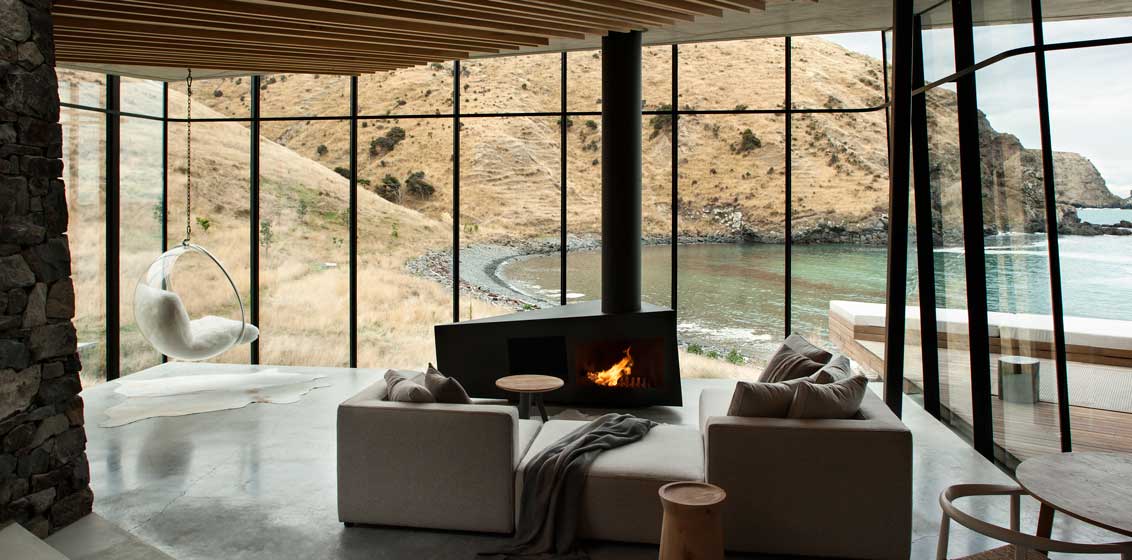 Seascape and Scrubby Bay at Annandale are two remote, ultra-modern coastal retreats hidden away on a 1,620 hectare working farm above the Banks Peninsula, just a short heli-hop from Christchurch. Seascape is a romantic gem suited for two, with a turf roof, stone walls, and glass façade. Scrubby Bay, a larger, luxury four-bedroom villa which can accommodate up to 14 guests with a private pool.