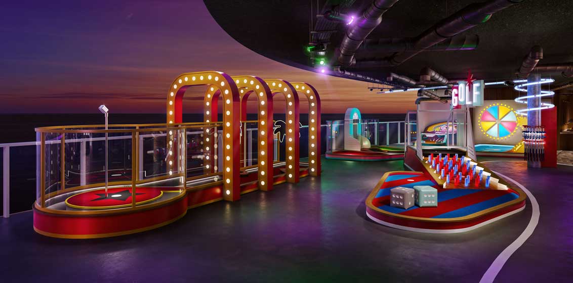 NCL will introduce Tee Time, a supercharged version of minigolf, where guests can enjoy nine interactive holes set among a Vegas-style backdrop and even have a chance to win worth-your-while prizes.